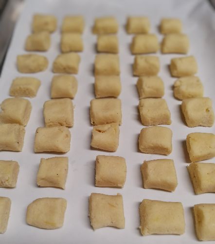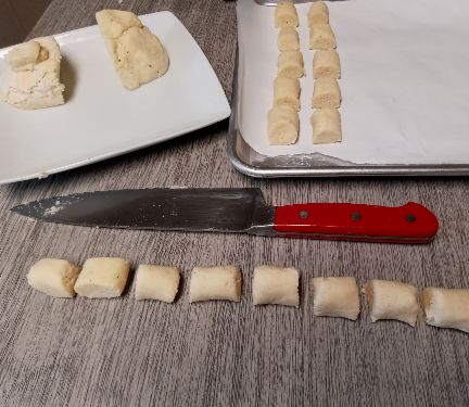 - Cut each log into roughly 10 even sized pieces, placing each gnocchi onto a parchment lined sheet tray . Do this with the other 3 wedges. You should end up with approximately 40 gnocchi altogether.