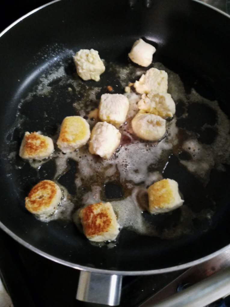 - Add more butter to the nonstick skillet, as soon as it melts drop in half of the pre boiled gnocchi. Pan fry each gnocchi until it’s just golden and a little crisp, then flip over and do the same. Then repeat process with the remaining gnocchi.