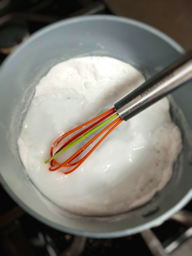 - In a small saucepan add the water and allulose and whisk together until the water has absorbed the sweetener and has a “donut glaze” consistency.