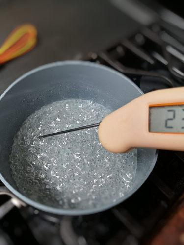 - Once the liquid starts to slowly bubble you can stop stirring and allow to keep heating up until the liquid has a light gold/amber look to it, or it reaches 300F with either an instant read thermometer or a candy thermometer. (This will take some patience and very regular checking on the temperature. If you take it too far, it will start to have a burnt taste)