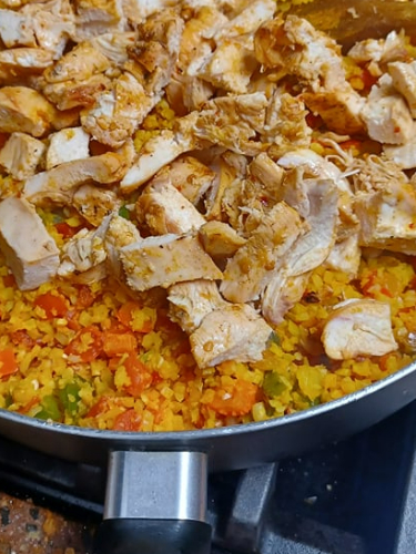 - Add in your prepared rice and stir in with the vegetables until rice is warmed back through.