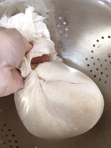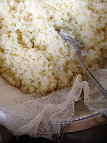 - After the cauliflower is done in the microwave, lay a thin layer of cheese cloth in a metal colander/strainer, and empty the cauliflower into it. Tightly wrap the cauliflower with the cheese cloth and begin twisting, so that the cauliflower releases as much water as you can get out of it (Please be careful not to burn yourself, as the cauliflower and it’s liquids will be extremely hot). This step is essential for the texture when cooking it in the skillet, otherwise it will just boil and not sauté.