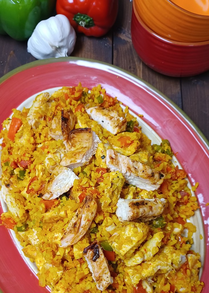 When we lived in Australia we used to frequent a Portuguese Chicken Restaurant called Nando’s, and my favorite dish was their Paella Grande. A mildly spiced rice with onion, garlic and red and green peppers, topped with their piri-piri marinated, char-grilled chicken breast.