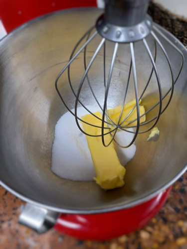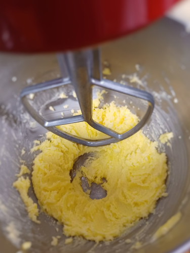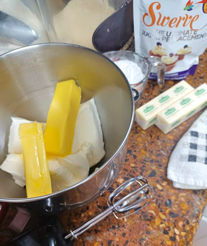 - In a large bowl, add butter and sweetener and beat on medium for 5 minutes, or until it starts to look light and fluffy.