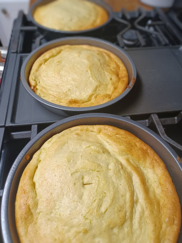 - Pour out cake batter evenly between the 3 greased cake pans. Smooth out the top and give each cake pan a tap on the counter to knock out any air pockets.