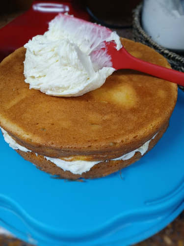 - Put your first cake layer onto a cake board or decorating stand, add a layer of frosting, then do the same with your second and third cake layers.