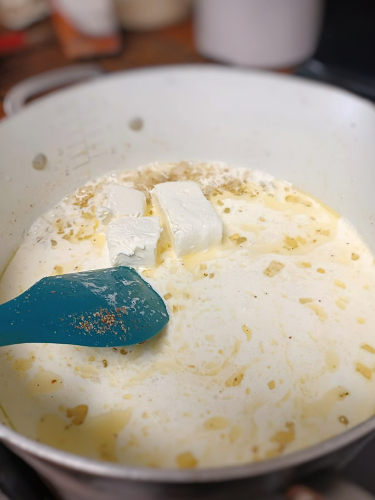 - Add in your cream cheese, stir and allow to melt, then add in your grated parmesan cheese.