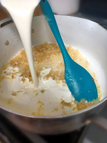 - Add in the heavy whipping cream, stir, and allow to come to a simmer.