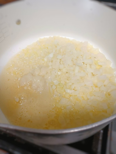- In a large pot, melt the butter with the garlic and onions, and sauté on medium low heat until the onions are translucent.