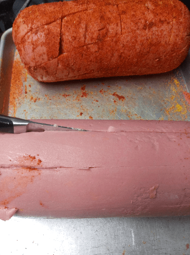 - Score the bologna vertically and horizontally about a 1.5 inches apart, be sure not to cut in too deep.