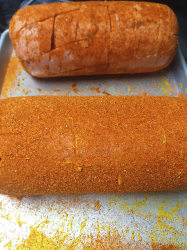 - Evenly sprinkle on our Memphis Style Barbecue Rub, being sure to get some in the slits that you’ve created. Give it a nice good coat of rub.