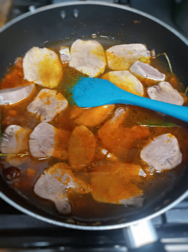 - Arrange your tongue slices into a single layer and add in your red wine, and allow to boil for 1 minute, now add in your chicken broth until it comes half way up your tongue slices. (We are wanting to braise the meat, which means it’s not fully submerged)